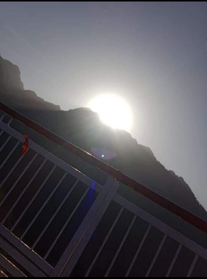 The sun will soon emerge from behind the hills. It starts out with a curled shape, but quickly turns into a full circle and radiates sunshine all around.