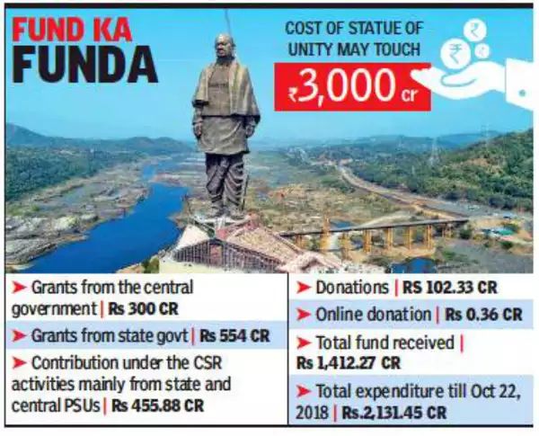 The Statue of Unity was built by a Public Private Partnership model, with most of the money coming from the Government of Gujarat. The Gujarat state government had allotted ₹500 crore (equivalent to ₹755 crore or US$94 million in 2023) for the project in its budget from 2012 to 2015. In the 2014–15 Union Budget, ₹200 crore (equivalent to ₹320 crore or US$40 million in 2023) was allocated for the construction of the statue. Funds were also contributed by Public Sector Undertakings under the Corporate Social Responsibility scheme.